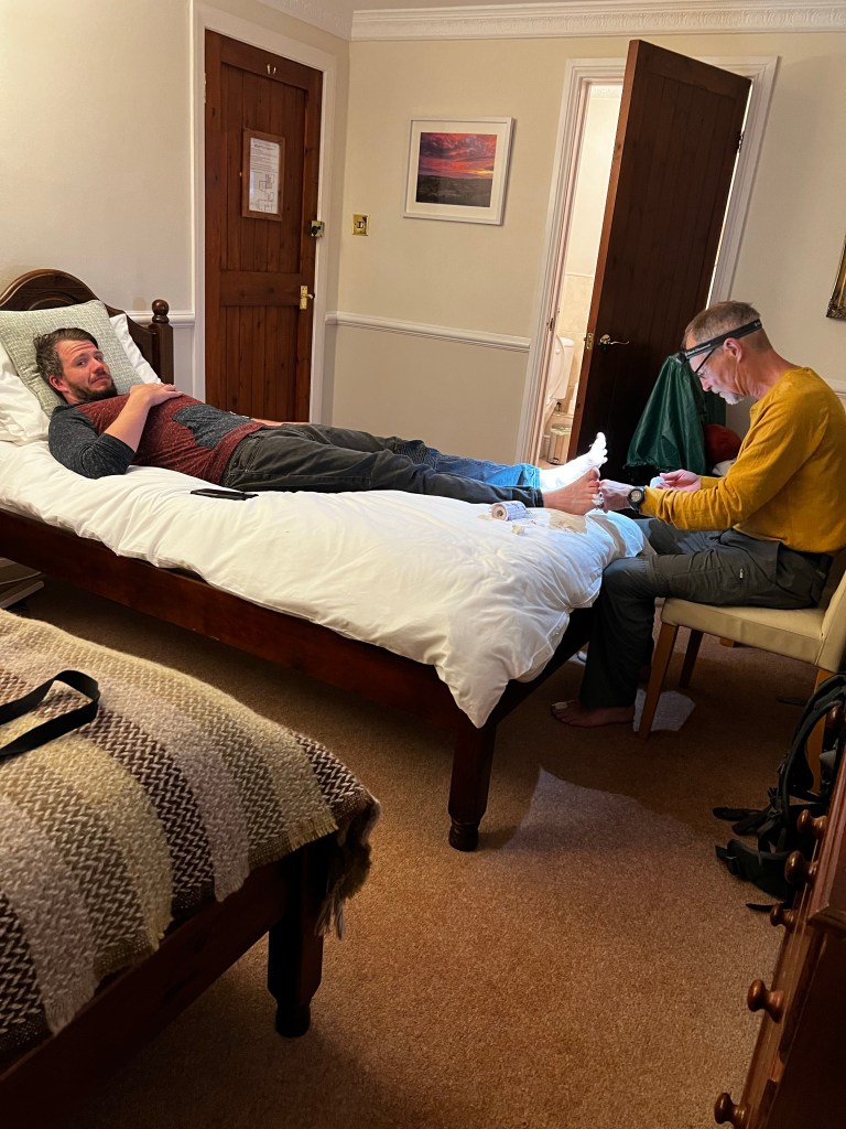 Day four was an extremely long day with lots of climbing, and going downhill and going uphill and going downhill. Unfortunately, it was also a day that there was no amenities along the way such as places to fill our water jugs or get beer. When we are done about 12 miles blistered and beaten, I tried that little transit thing on Google maps and lo and behold in an hour a bus was coming to a place near where we were take us to Chollerford. Typical evening photo