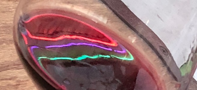 A thunder egg is essentially an agate (or jasper) inside a volcanic rock shell. We were staying in Prineville, OR, which is the rockhounding centre of central Oregon. Beautiful forests, sadly many of them burned last summer. It is
